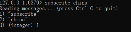 - 先开启一个redis-cli(S1),并监听着china这个channel
