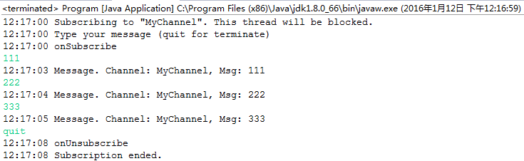 为简单起见,这个发布者接收控制台的输入,然后将输入的消息发布到指定的channel上面,如果输入quit,则停止发布消息。