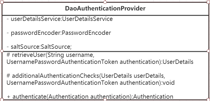 AuthenticationProvider最最最常用的一个实现便是DaoAuthenticationProvider。顾名思义,Dao正是数据访问层的缩写,也暗示了这个身份认证器的实现思路。由于本文是一个Overview,姑且只给出其UML类图: