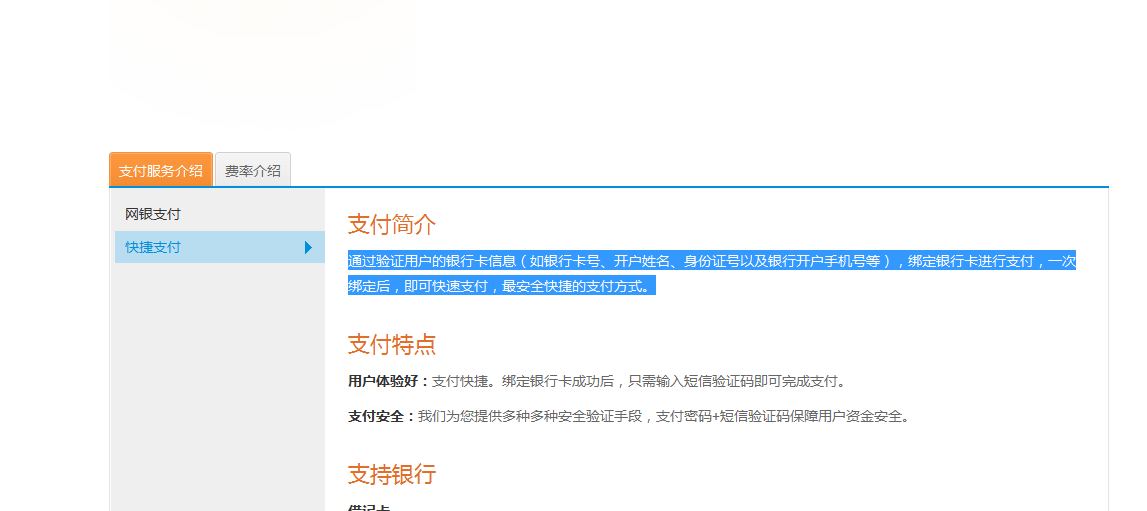 快捷支付 即首次支付时通过验证用户的银行卡信息(如银行卡号、开户姓名、身份证号以及银行开户手机号等),绑定银行卡进行支付,一次绑定后,即可快速支付,最安全快捷的支付方式。