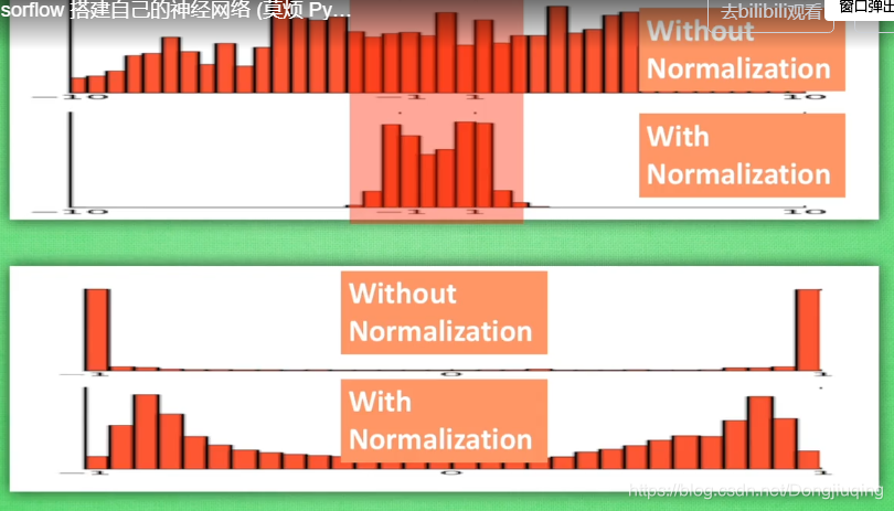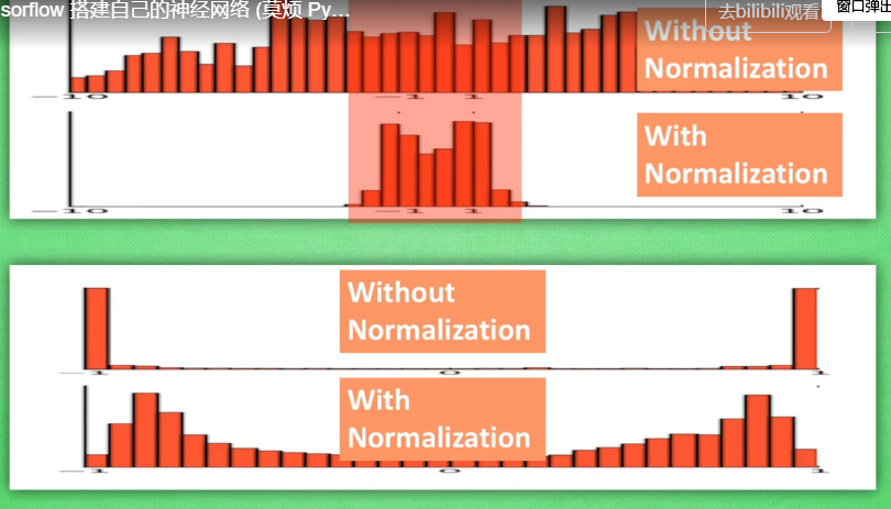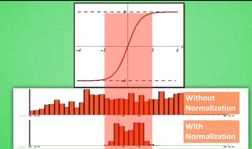 下面是批量标准化的两张图,这两张图说明了为什么要进行批量标准化(BatchNormalization)。批量标准化可以用于隐藏层中。进行了标准化后可以让特征集中分布在中央。然后经过一个sigmoid或者tanh的处理,这样可以得到一个很好的值,想象一下,如果一个特征值为3,一个特征为30,经过tanh处理后,得到的值分别为0.96和0.99,这就相当于我的神经网络对输入得数据缺少了感知能力。但是如果标准化到一定的区间内,比如把这个范围缩小10倍,得到了0.3和3两个特征值,在经过激活函数处理,那么处理过后的结果可能就是0.2和0.96,这样有利于更深层次的前向和反向传播。网络搭的越深,往往后面梯度就消失了,因为特征值太大了,因此加入BN层可以使网络得到更加有效的数据。