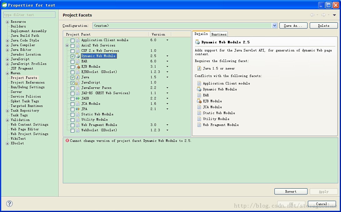 我们用Eclipse创建Maven结构的web项目的时候选择了Artifact Id为maven-artchetype-webapp,由于这个catalog比较老,用的servlet还是2.3的,而一般现在至少都是2.5,在Project Facets里面修改Dynamic web module为2.5的时候就会出现Cannot change version of project facet Dynamic web module to 2.5,如图: