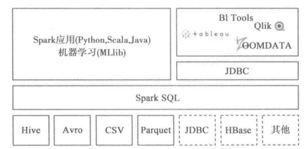 Spark SQL最常见的用途之一就是作为一个从Spark平台获取数据的渠道。支持从现有Apache Hive表以及流行的Parquet列式存储格式中读取数据的支持以及其他格式的支持如JSON。Spark SQL支持的数据源如下图所示。