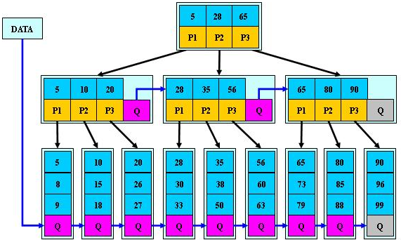 3. d是表示树的宽度,除叶子节点之外,其它每个节点有[d/2,d-1]条记录,并且些记录中的key都是从左到右按大小排列的,有[d/2+1,d]个孩子;