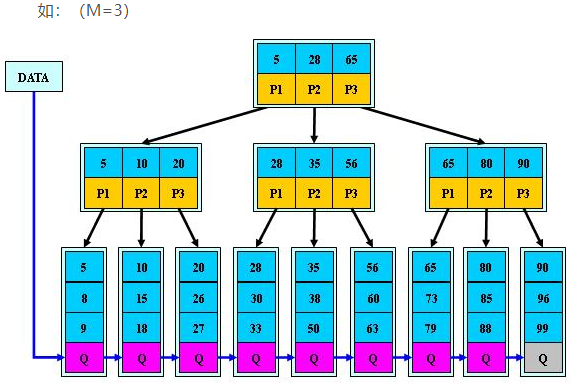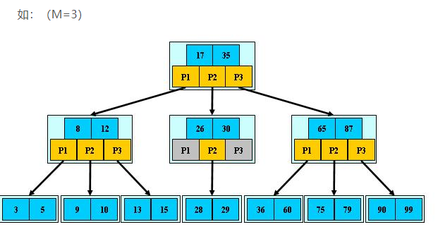 4. 在一个节点中,第n个子树中的所有key,小于这个节点中第n个key,大于第n-1个key,比如上图中B节点的第2个子节点E中的所有key都小于B中的第2个key 9,大于第1个key 3;