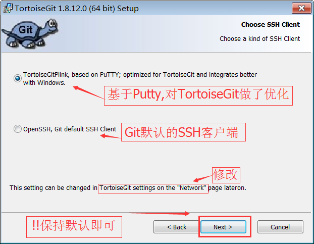 6.1下一步,选择SSH客户端. 可以选择 TortoiseGitPlink(位于TortoiseGit安装目录/bin 下), 也可以选择 Git 默认的SSH客户端,位于 Git安装目录/bin/ssh.exe(如果配置了 Path,那直接是 ssh.exe)
