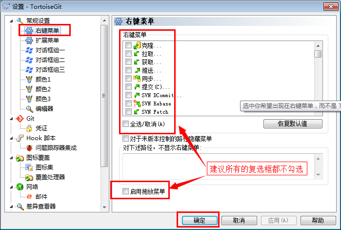 5. 配置右键菜单. 在设置对话框中,点选左边的"右键菜单",然后在右边将所有的复选框都去掉,这样右键菜单显得比较干净: