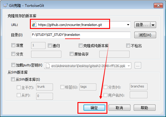 在工作目录下,如 “F:\STUDY\GIT_STUDY”中,鼠标右键点击空白处,选择: TortoiseGit --> 克隆...(clone...) ;则会弹出克隆对话框,如下图所示: