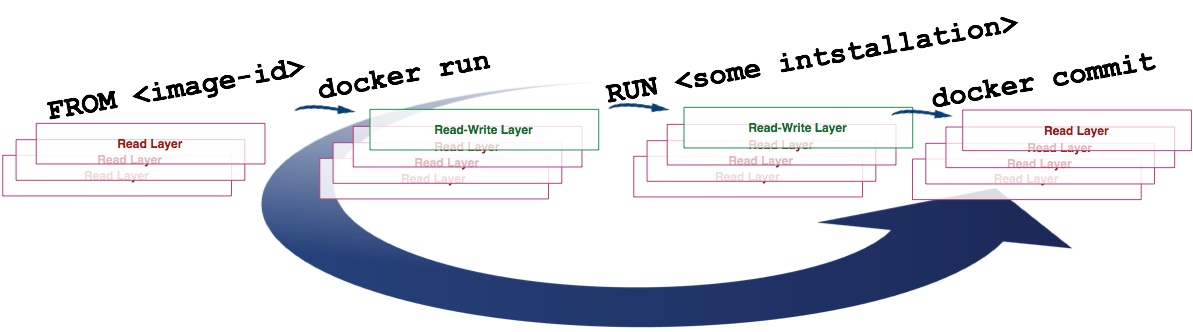 我们从上图可以看到,build命令根据Dockerfile文件中的FROM指令获取到镜像,然后重复地1)run(create和start)、2)修改、3)commit。在循环中的每一步都会生成一个新的层,因此许多新的层会被创建。