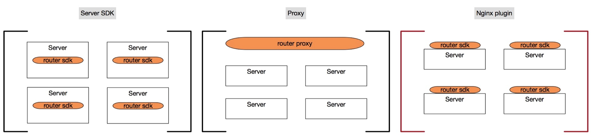 第一种SDK的方式因为对业务的强侵入性是首先被排除的,统一接入层进行代理和去中心化插件集成两种方案各有利弊,但当时首批要接入单元化架构的服务很多都还没有统一接入到gateway,所以基于现状的考虑使用了去中心化插件集成的方式,通过在应用的nginx集成UnitRouter。
