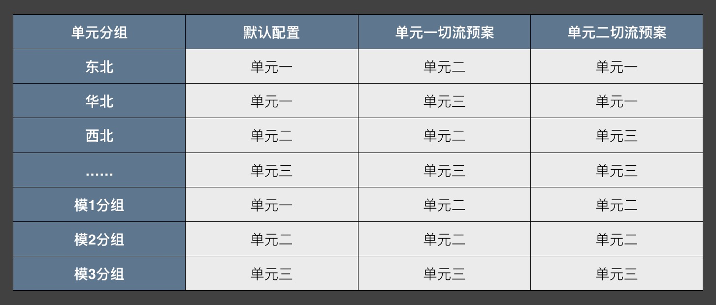 分组与单元的映射有一个默认关系,这是按地理就近来配置的,比如华南对应深圳。除了默认的映射关系,还有几个用于切流预案的关系映射。