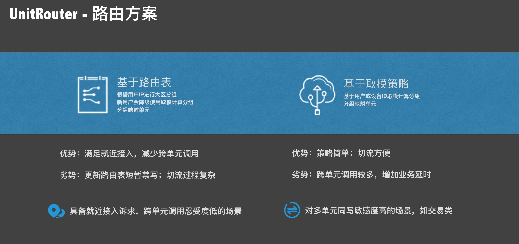 所以,在最终的单元路由实现上我们提供了传统的取模路由,和为降延时而设计的基于路由表路由两种策略。同时,为解无须登录的业务场景问题,上述两种策略除了支持用户ID,我们同时也支持设备ID。