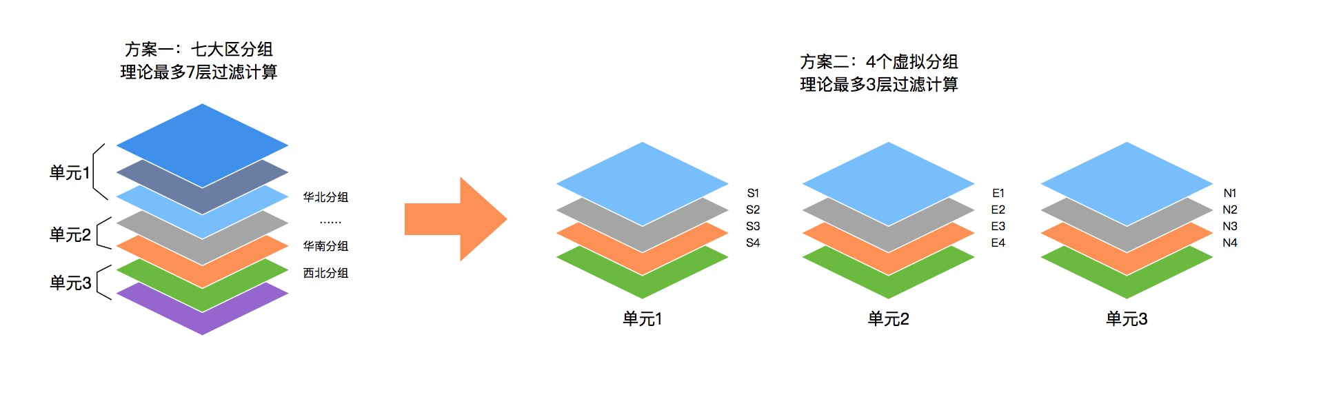 通过日志分析出用户所属大区后,我们将不同分组做成多个布隆过滤器,计算时逐层过滤。这个计算有两种特殊情况: