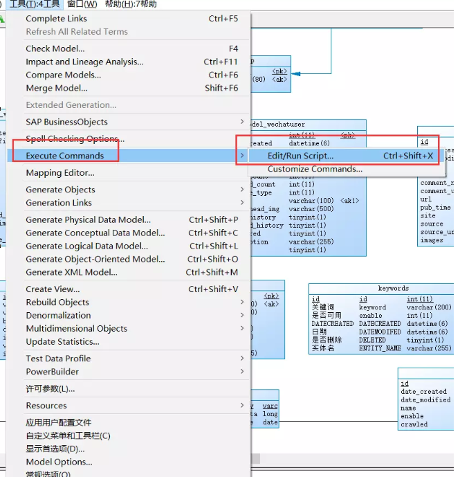 在PowerDesigner中,表结构的code,name字段均为英文,不易阅读,若需要将备注中的字段替换到name字段显示,则执行方法:Tools -- Execute Commands -- Edit/Run Script ,则弹出如下图中的对话框: