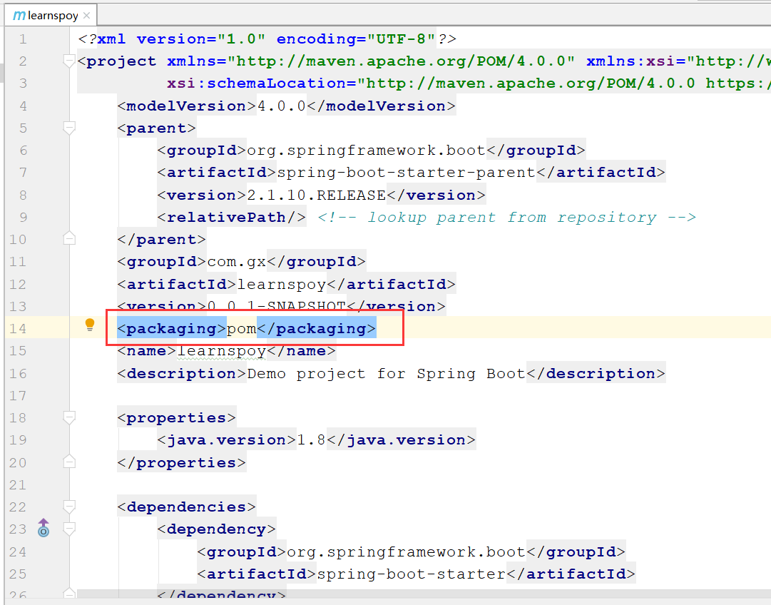 pom文件中<packaging></packaging>标签中的jar要改成pom,一定要修改,否则各个模块之间无法传递依赖,暂时只修改这些就行,创建最外层的项目结构后,因为没有springboot的启动类,所以我们采取多模块的形式,给项目一个启动的模块以及其他的模块。