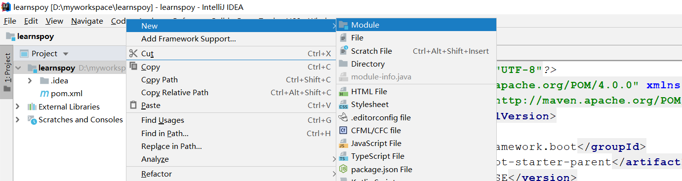 项目的结构如下,除了一个pom文件就没有其他了。后面我们会创建Module