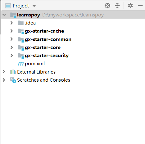 按着以上方式创建gx-starter-core,gx-starter-cache,gx-starter-common,gx-starter-security等模块,创建所有模块以后的项目结构如下:
