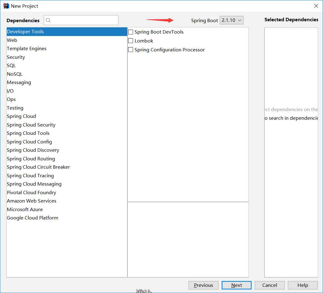 选择Springboot的版本选择2.1.0,这里我们先不用选择任何依赖,后面我们手动添加依赖,点击next