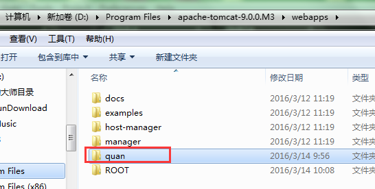 1.在webapps中新建一个文件夹,命一个名字,这里我就命名为“quan”