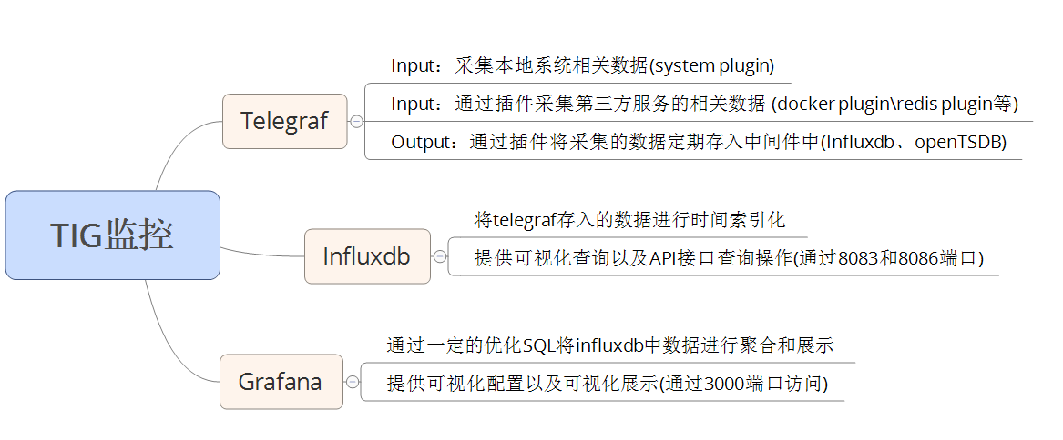 telegraf为数据采集器,通过监控指标的配置将相应的数据采集并存储到influxdb中,进而进行时间序列化,而grafana最终通过influxdb中提供的源数据进行聚合分析和展示。