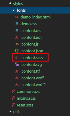 下载好阿里字体图标后,复制fonts文件夹到项目目录,如下图放在:styles目录下,并将iconfont.css复制一份改为iconfont.scss