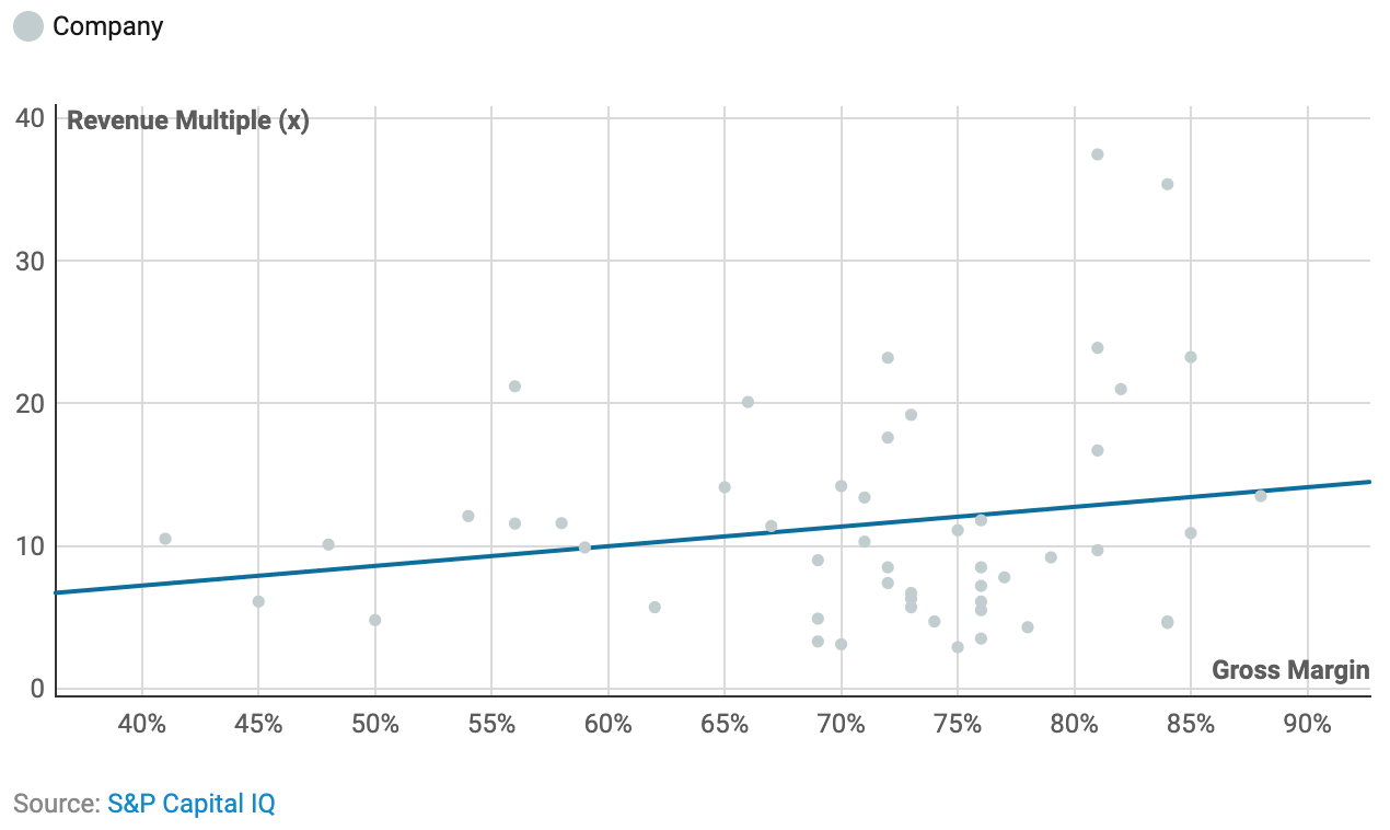 估值与收入增长高度相关。这是有道理的,因为投资者乐于为快速增长的资产付出高昂的代价。不太明显的是,通过证明任何给定公司的利润能力,毛利率也可以对价值产生有意义的影响。不是今天,而是公司成熟时(即稳定状态)。我认为,毛利率可以洞察任何一家特定的SaaS公司到期时的现金产生潜力。下图显示了毛利率与估值之间的相关性。