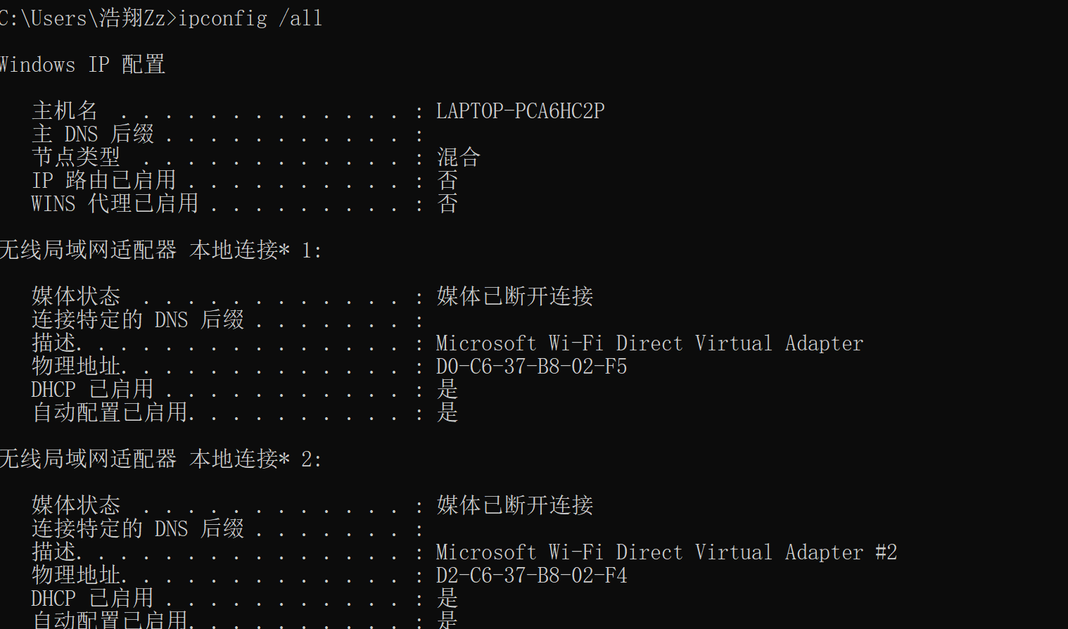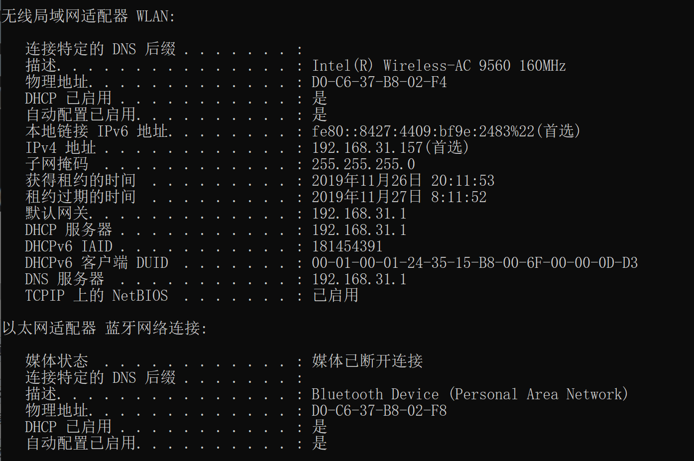 (1)使用ipconfig /all 来观察本地网络设置是否正确,如下图所示