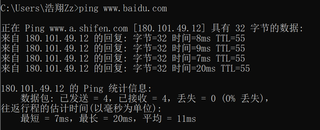 ping用于确定本地主机是否能与另一台主机成功交换(发送与接收)数据包,再根据返回的信息,就可以推断出TCP/IP参数是否设置正确以及运行是否正常、网络是否通常等。