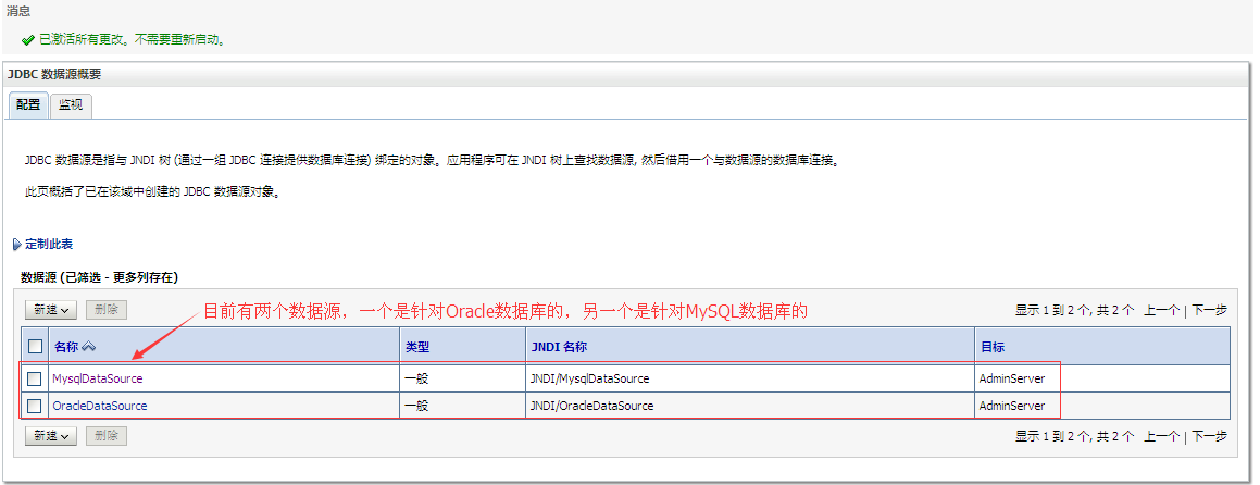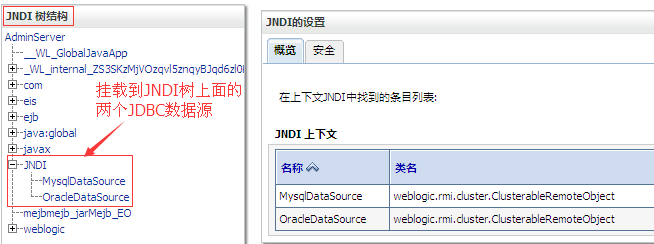 到此,在WebLogic新建针对MySQL数据库的JNDI数据源就算是全部完成了。查看jndi树,可以看到JNDI树上面挂载了两个数据源,如下图所示:
