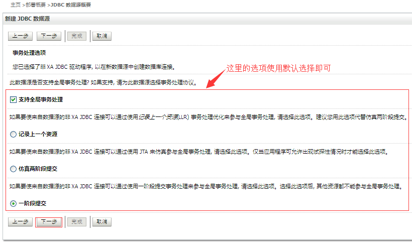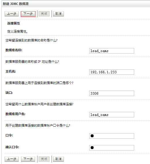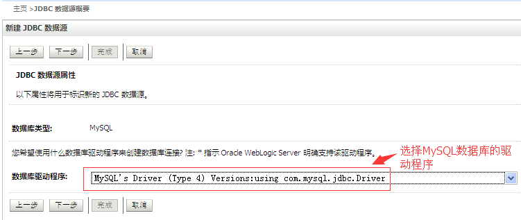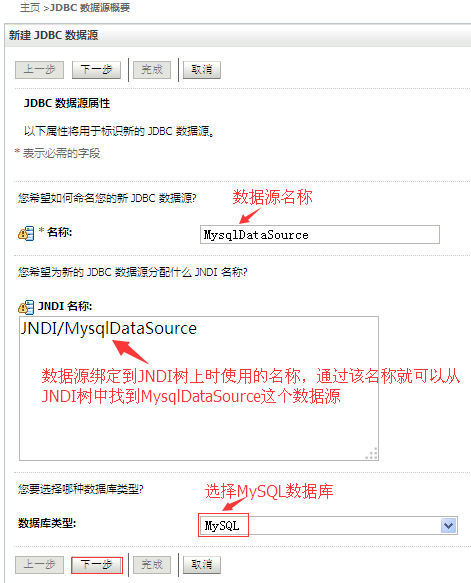 上面我们已经配置好了一个针对Oracle数据库的JNDI数据源,这里我们在新建一个针对MySQL数据库的数据源,配置步骤和上述针对Oracle数据库创建的JDBC数据源大部分是一样的,针对不一样的地方给出如下的截图说明: