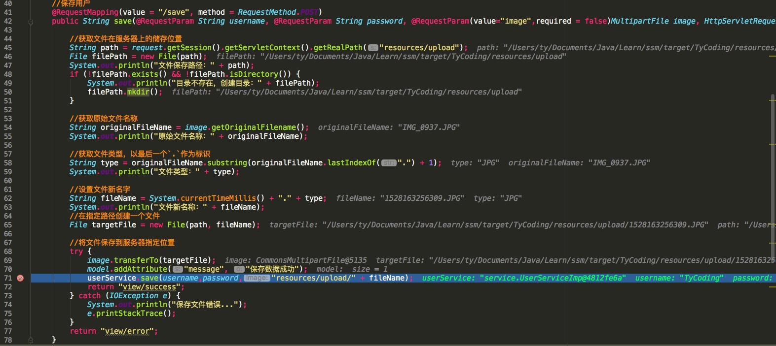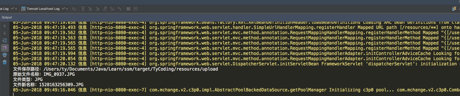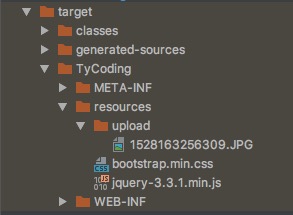 request.getSession().getServletContext().getRealPath()获取到的是本项目的绝对路径,而getRealPath("resources/upload")是针对此项目的相对路径,如此时的文件保存路径其实是:/Users/ty/Documents/Java/Learn/ssm/target/TyCoding/resources/upload。 - 如果指定路径下的文件夹存在,就将上传的文件写入进这个文件夹中,如果此文件夹不存在,就调用