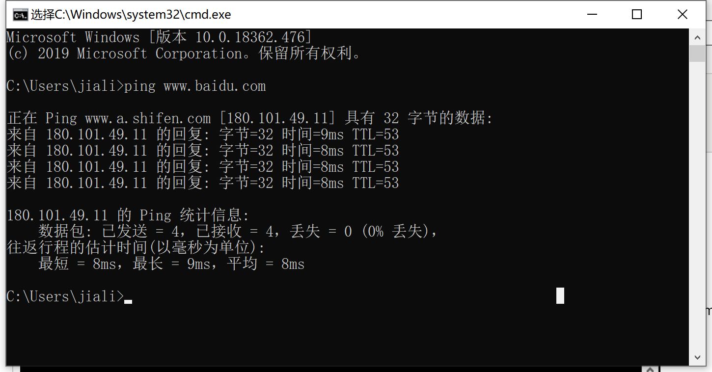 在提示符下,键入“ ping”以及您要ping的URL或IP地址,然后按Enter。在下图中,我们正在对www.baidu.com进行ping操作,并获得了正常的响应。