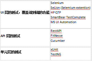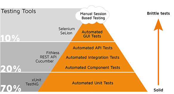 我们采用敏捷测试金字塔作为我们敏捷测试策略的基础。它展示了各个测试层次所需要的工作量。传统来说,大多数工作都集中在GUI这个层面上。在GUI这层上,测试要非常小心,而且维护起来是很昂贵的。在这种模式下,并不是所有业务和集成逻辑都是通过GUI这层来测试的。在GUI上,即便是很小的变动,也会破坏测试的完整性。因此,使用敏捷测试这种金字塔策略,我们跟客户一起将测试转移到更低的层次,让UI的变化不会再影响或破坏我们的测试。