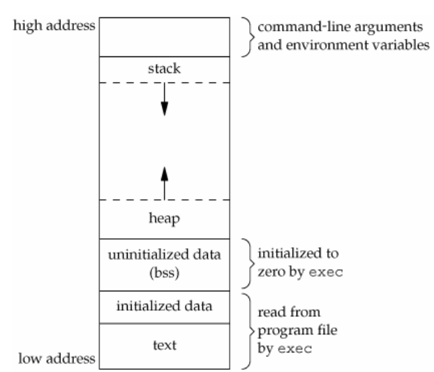 3. 非初始化数据段: 声明在函数之外的变量存放的地方, 通常会被内核初始化为0或者null.