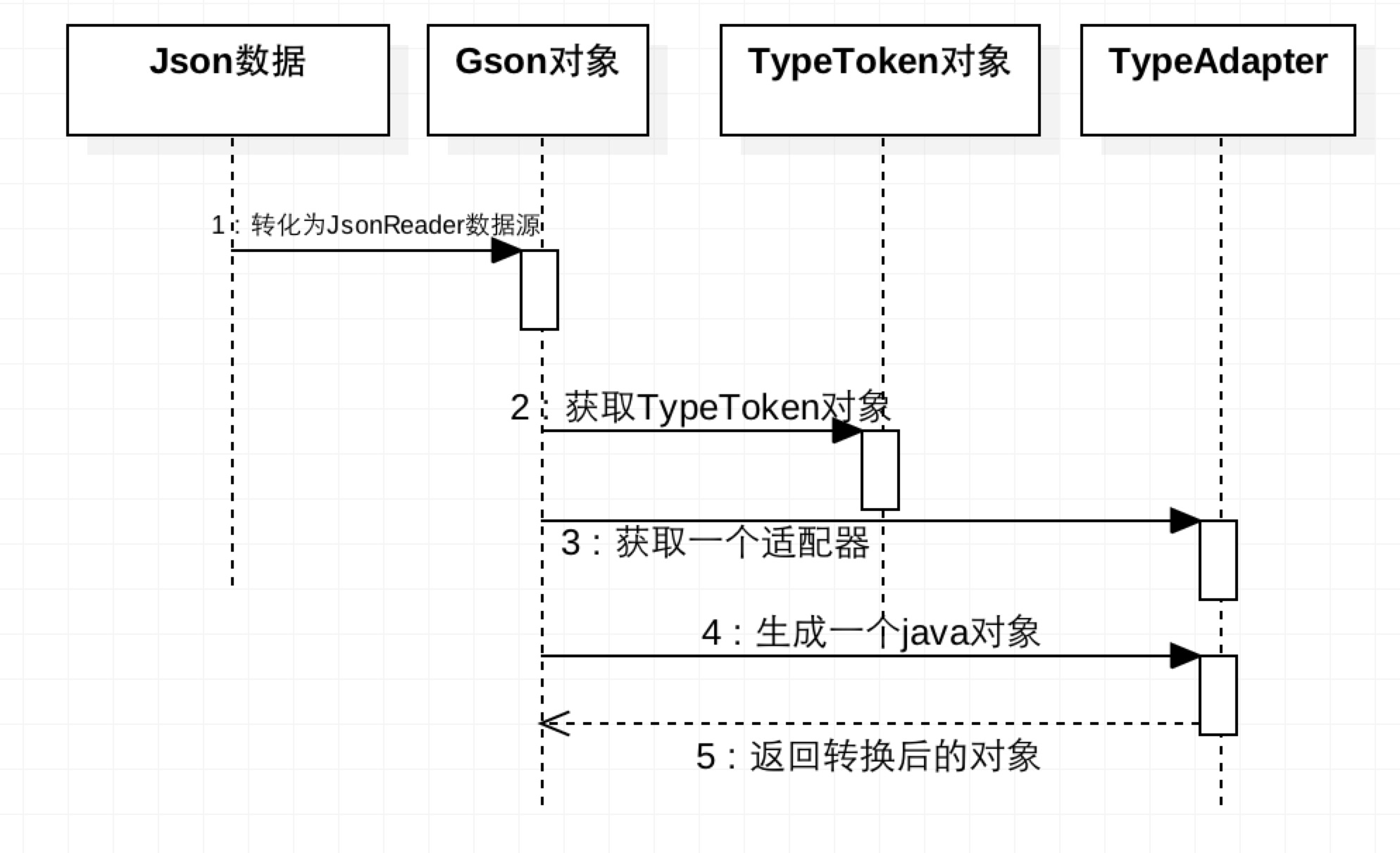 就像我们上面说的一样,在代码#step1 中,Gson会将真实的字符IO流Reader装饰成为在stream包下的JsonReader流。在代码#step3位置,Gson会通过Java既定的类型找到Gson所转换的type类型(reflect包下的TypeToken对象)。然后通过这个类型调用代码#step4的语句,获取一个类型转换的适配器TypeAdapter。适配器获取到Reader输入源之后,就可以将Json数据转化成为对应的对象。