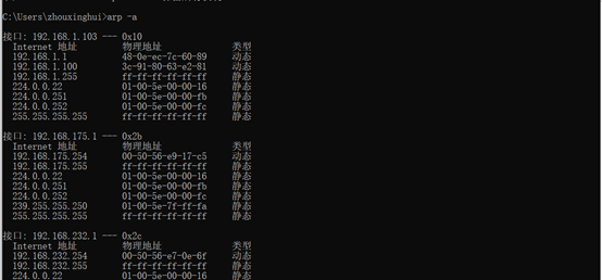 (1)arp –a //显示本机缓存表中记录,可能由多个接口使用ARP,显示每个ARP表项