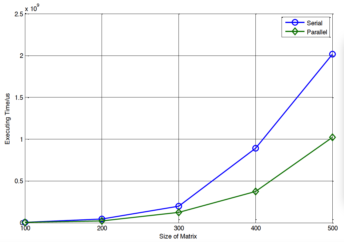 由以上的实验,可以明显看到,相同的计算量,并行方式下的计算时间明显小于串行方式下的计算时间,更直观的对比如图4-1: