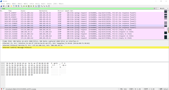 主机172.10.100.112向180.101.4911发送一个信息类型为8,代码为0的ICMP请求回显包,路径上第一个路由器在转发数据包之前将数据包上的TTL递减 1,当数据包上的TTL减为0时,路由器丢弃该数据包,并将“ICMP Time Exceeded”(超时)的消息发回源主机A,此时,发现路径上的第一个路由器。