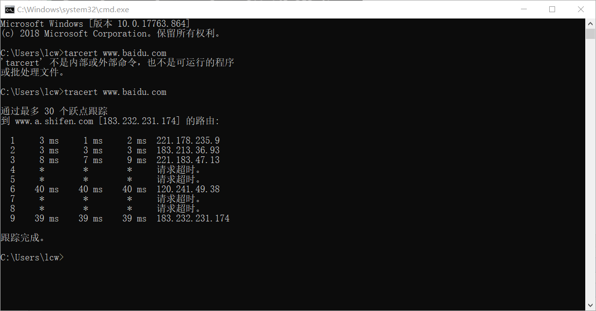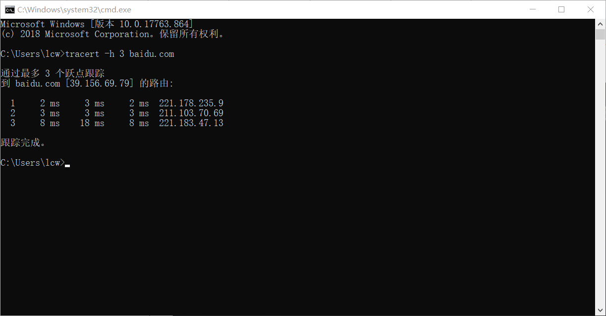 例3、“tracert -d baidu.com”代表不将IP地址解析到主机名称,如下图所示: