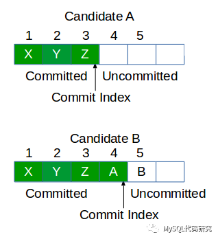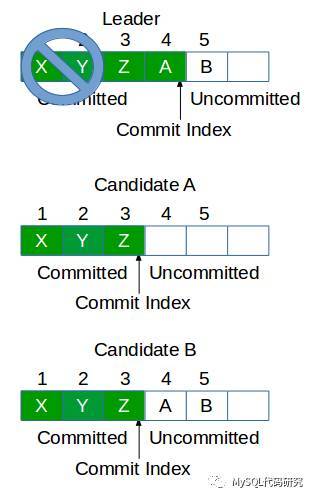 我们知道已经提交的日志是不能够丢弃的,必须要最终复制到所有的节点上才行。假如在选Leader时,图中Candidate A变成了Leader,就必须要首先从Candidate B上将日志4复制过来,然后才能开始处理新的日志。为了减少复杂性,raft就规定,只有包含了所有已提交日志的Candidate才能当选为Leader。