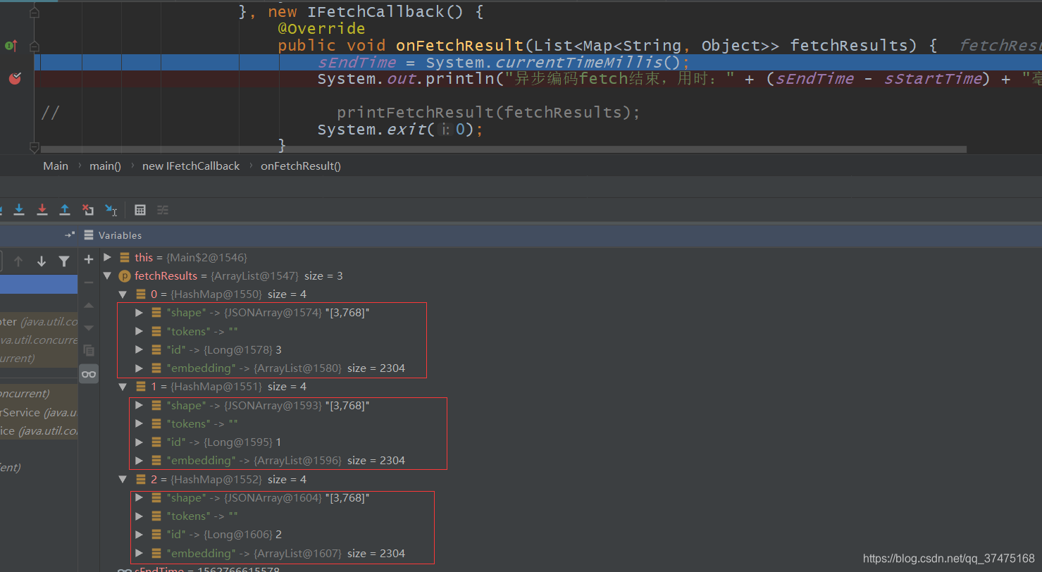 java版返回了三个映射,一个映射里有一个大小为2304的结果列表;而python版直接返回了大小为6912的ndarray,大小对的上,说明异步获取结果也实现了
