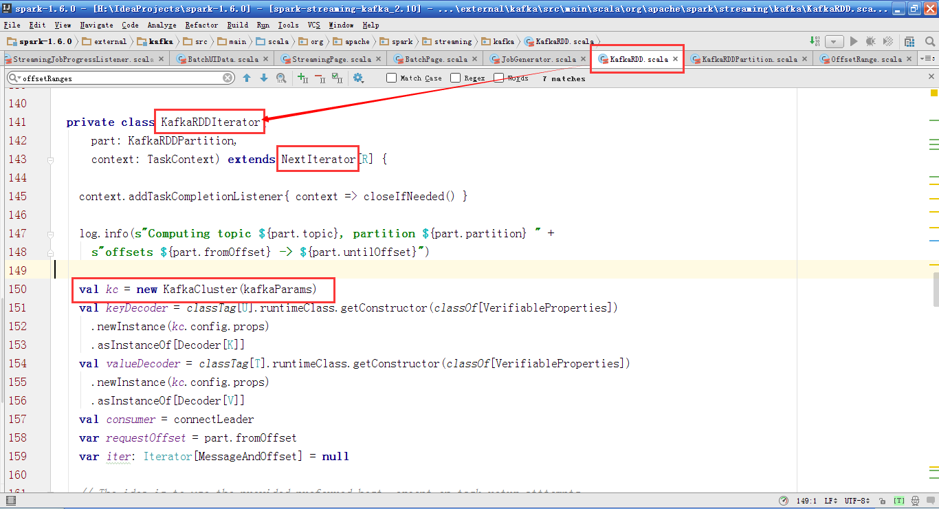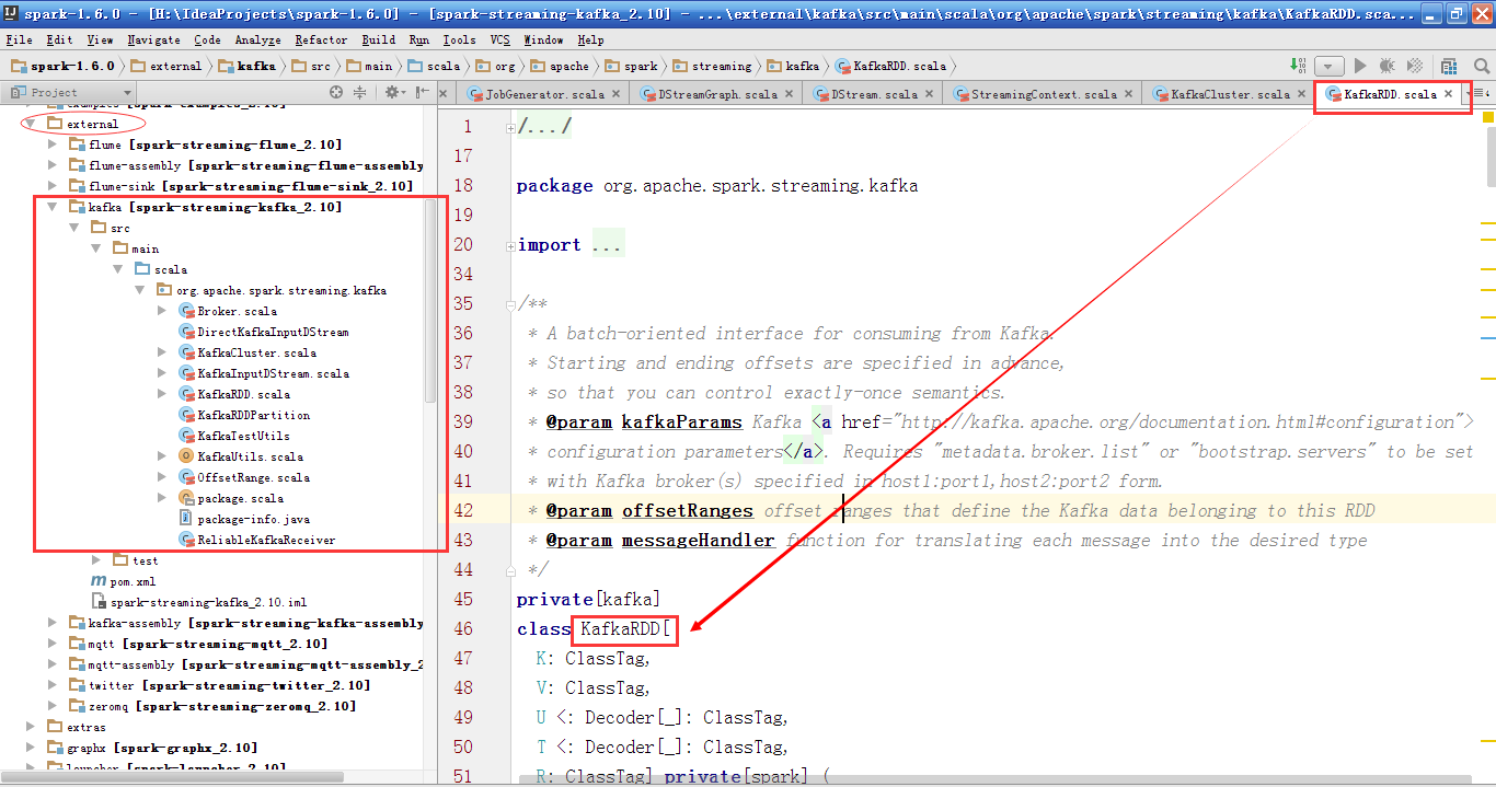 从Spark Streaming-Kafka包中主要有10个类,我们先讲解KafkaRDD这个类,KafkaRDD继承RDD,其构造器中需要传入Kafka的配置信息(如Kafka的Broker集合),偏移量信息,每个Topic的Partition的Leader信息,消息处理函数。