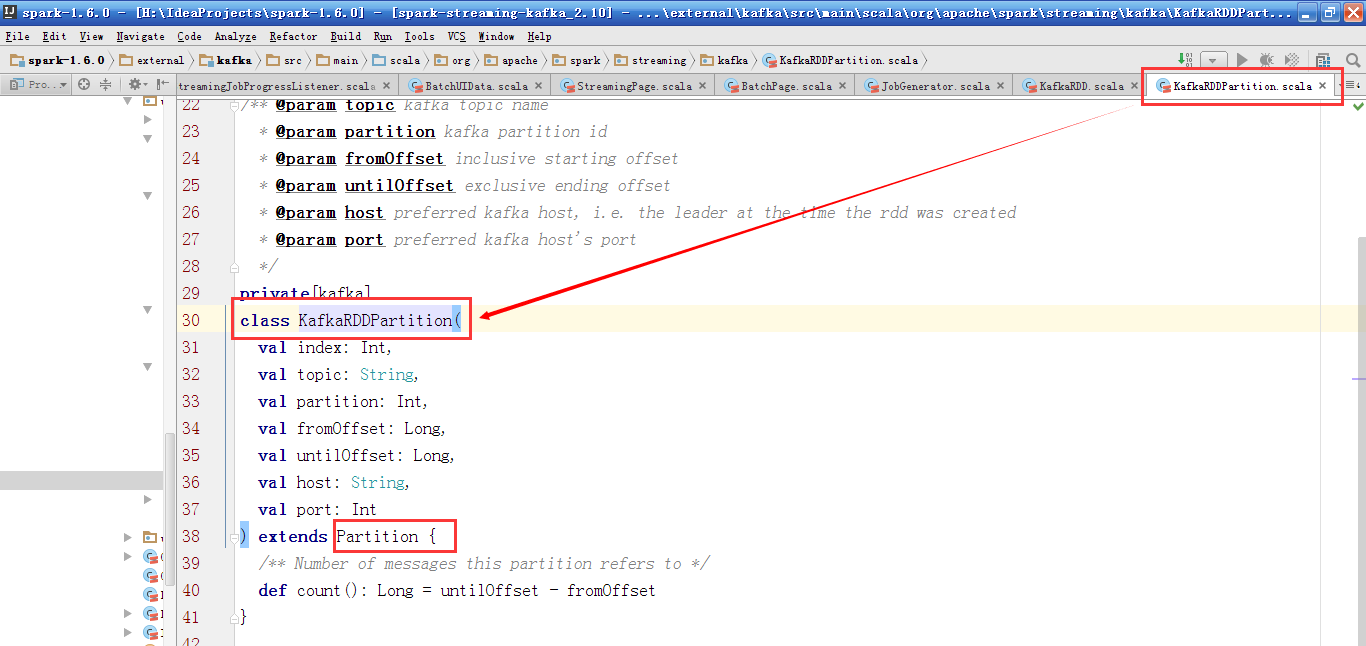 其中KafkaRDDPartition继承Partition,封装了Partition的信息,如topic,偏移from和until,Broker的host和port信息。