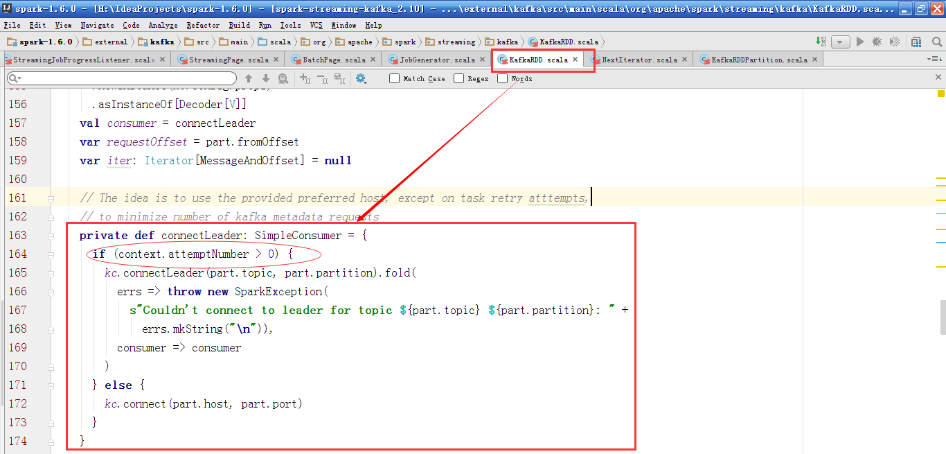 如果TaskContext中之前没有失败过,即attemptNumber为0,则直接以KafkaRDDPartition中的host和port信息来连接Kafka,返回SimpleConsumer(Kafak的简单消费者,备注Kafka中还有高级消费者的API);如果之前失败过,则找到该Partition新的Leader Broker信息,然后再进行连接。