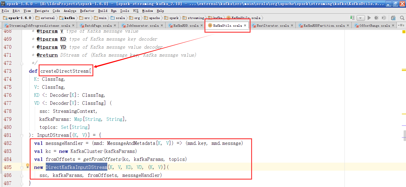 我们编写Spark Streaming Kafka Direct应用程序时,会调用KafkaUtils的createDirectStream方法,来创建DirectKafkaInputDStream。内部先构造KafkaCluster对象,并调用getFromOffsets方法获取到起始offset信息。