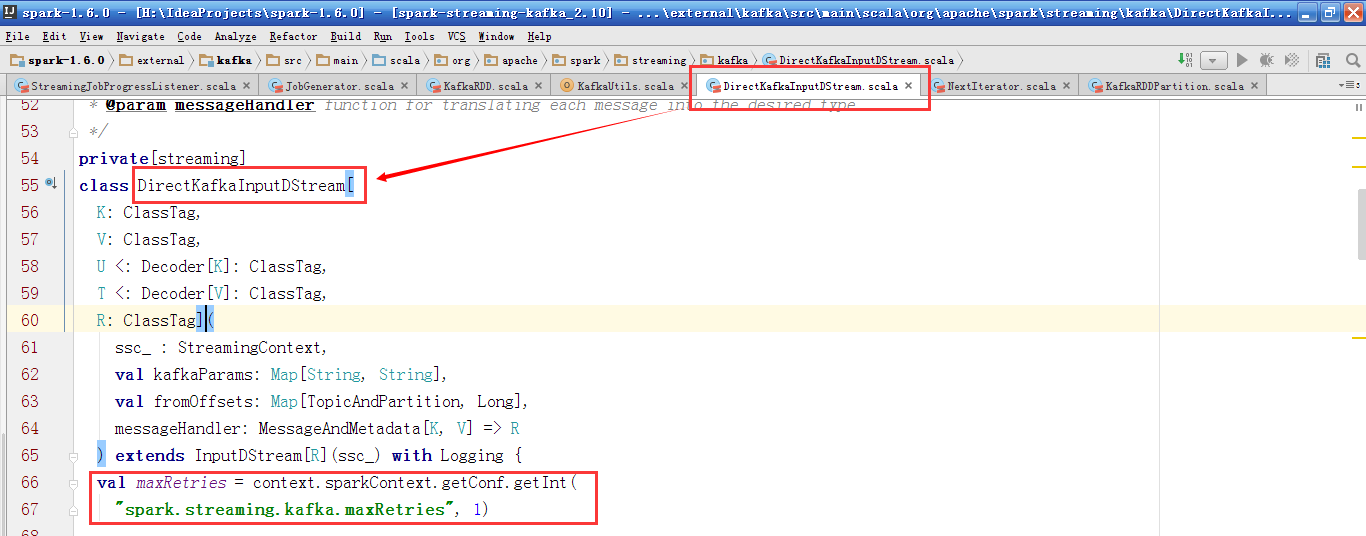 DirectKafkaInputDStream继承InputDStream,最大重试次数为1,来确保语义一致性。