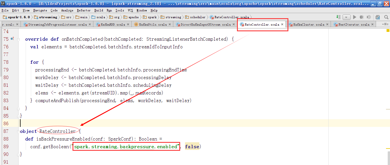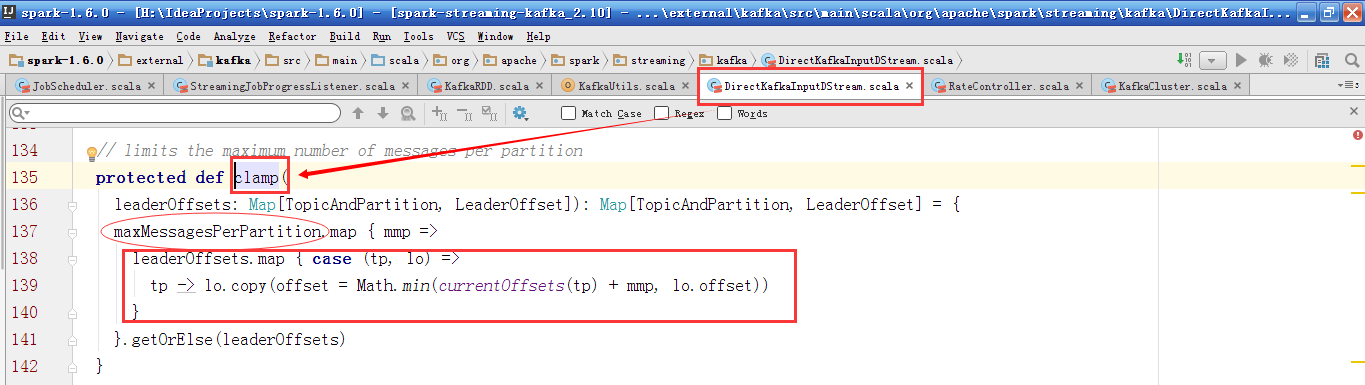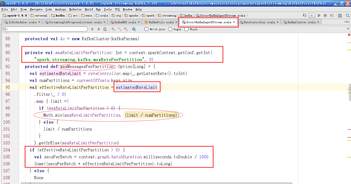 其中untilOffsets的值为clamp方法。从maxMessagePerPartition中获取。从配置文件中获取spark.streaming.kafka.maxRatePerPartition,比较maxRateLimitPerPartition和(limit / numPartitions)的值,并取最小值。其中sescPerBatch为传入的Duration的值,得到每一个BatchDuration处理的最大Offset值,当前的偏移量与允许每个Partition最大的消息处理量和该Partition当前的Offset值,这两个的最小值,作为untilOffsets。