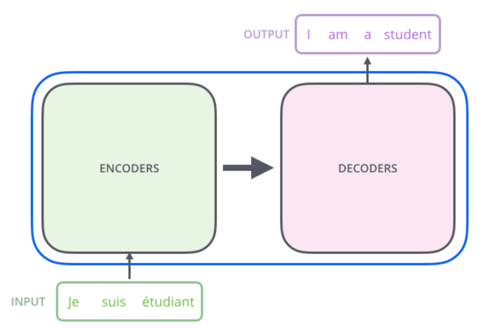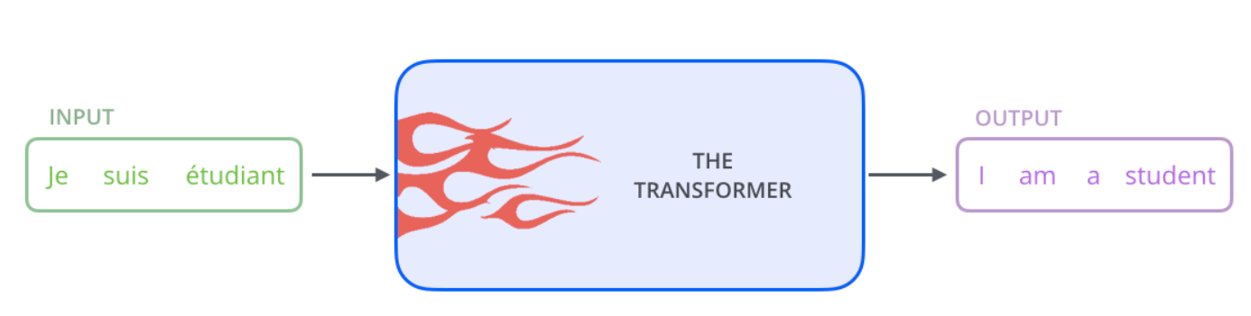 让我们首先将模型看作一个单独的黑盒子。在机器翻译应用程序中,它将使用一种语言的一个句子,然后输出另一种语言的翻译。