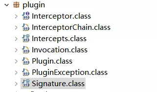Interceptor接口供插件实现,@Intercepts注解在插件实现上,表示这是一个插件类并配置将要拦截哪些类的哪些方法,@Signature定义将要拦截的方法信息,如类名、方法名、形参列表,Plugin类实现了InvocationHandler接口,是动态代理的具体实现,Invocation类包装了拦截的目标实例,InterceptorChain保存所有拦截器。