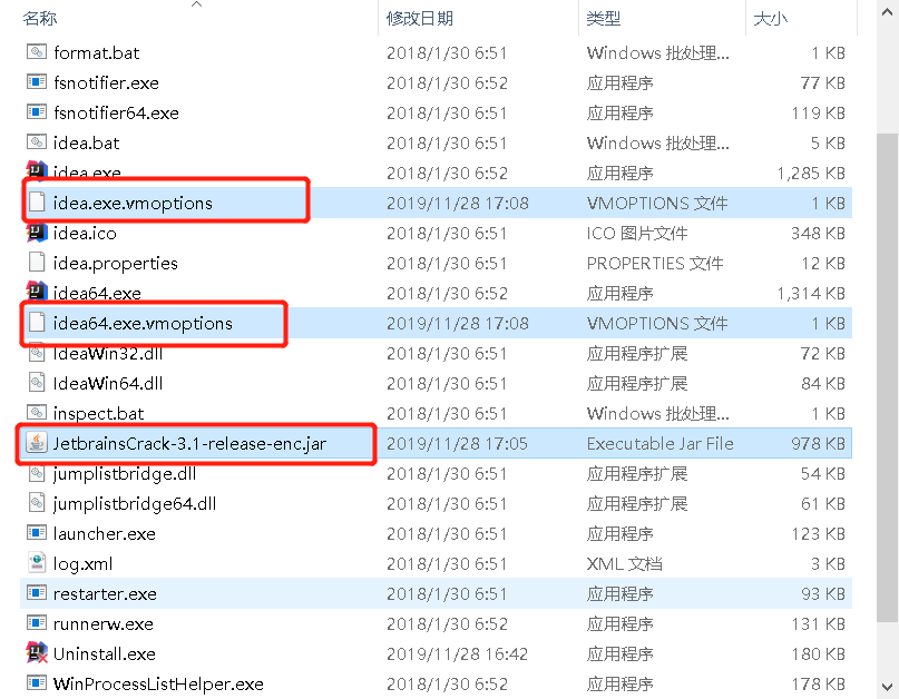 将文件中的 idea.exe.vmoptions,idea64.exe.vmoptions,JetbrainsCrack-3.1-release-enc.jar 这三个文件拷贝到IDEA安装文件的bin目录下